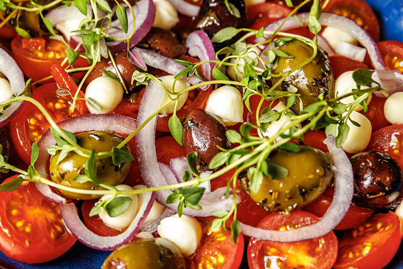 • Tomatsalat med oliven, mozzarellaperler, rødløg og pestodressing